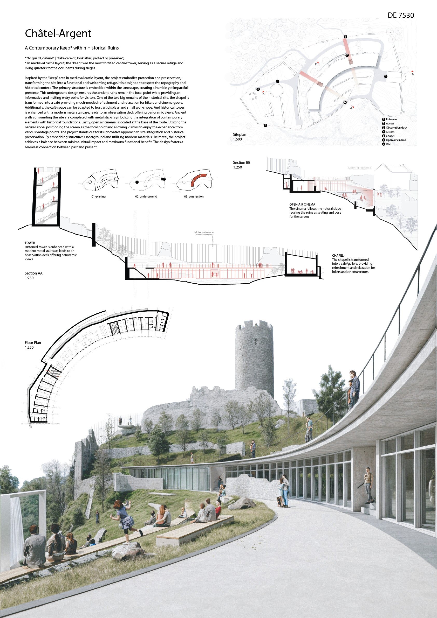 Inspired by medieval castle keeps, this project preserves historical ruins while creating a protective refuge. Embedded underground to respect topography, it keeps ruins central, offering an inviting visitor entry. The chapel becomes a café for refreshment, adaptable for art and workshops. A modern staircase enhances the tower for panoramic views. Ancient walls integrate metal elements. An open-air cinema uses natural slopes for varied viewing. It balances minimal impact with functional innovation, connecting past and present.